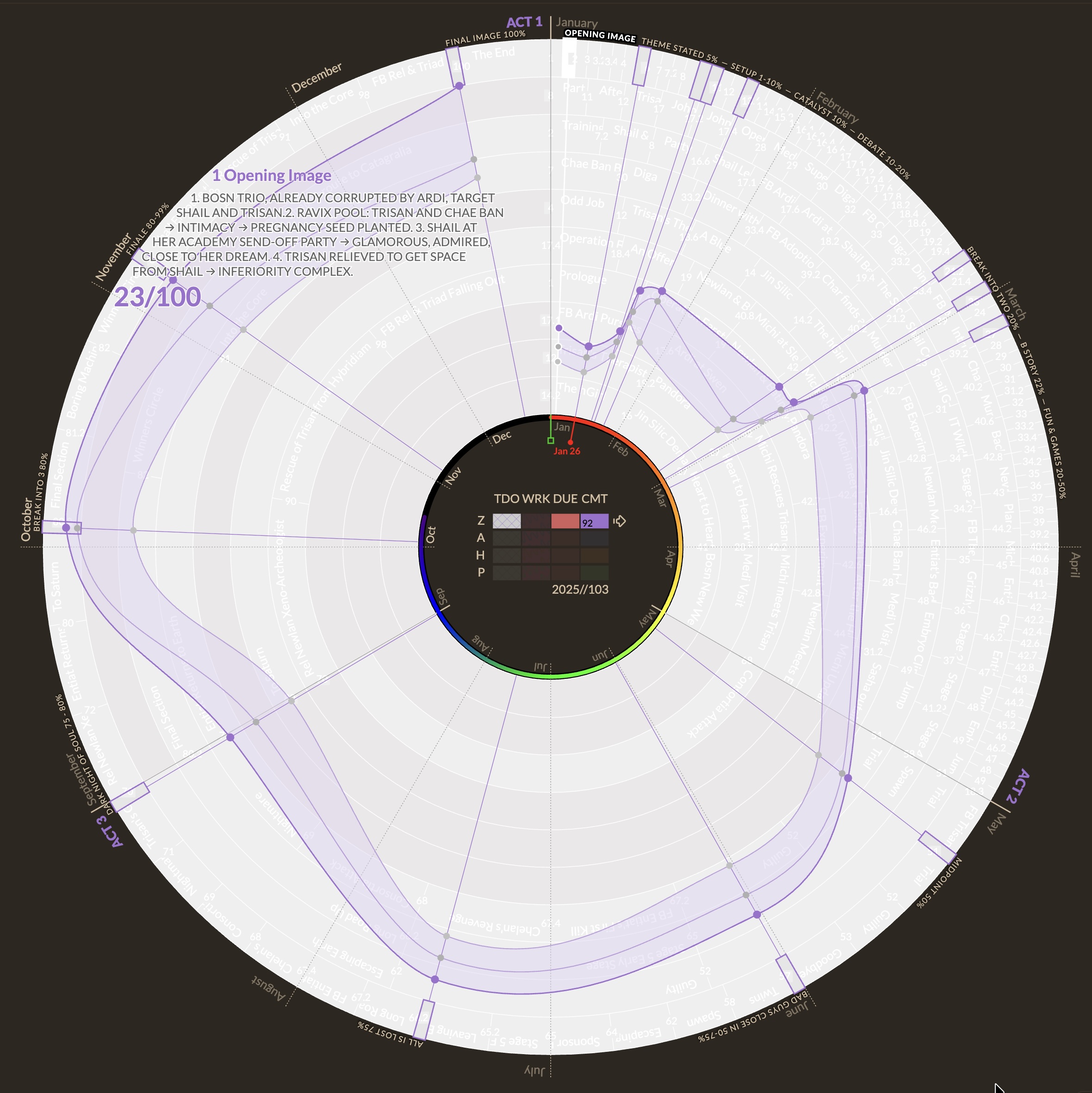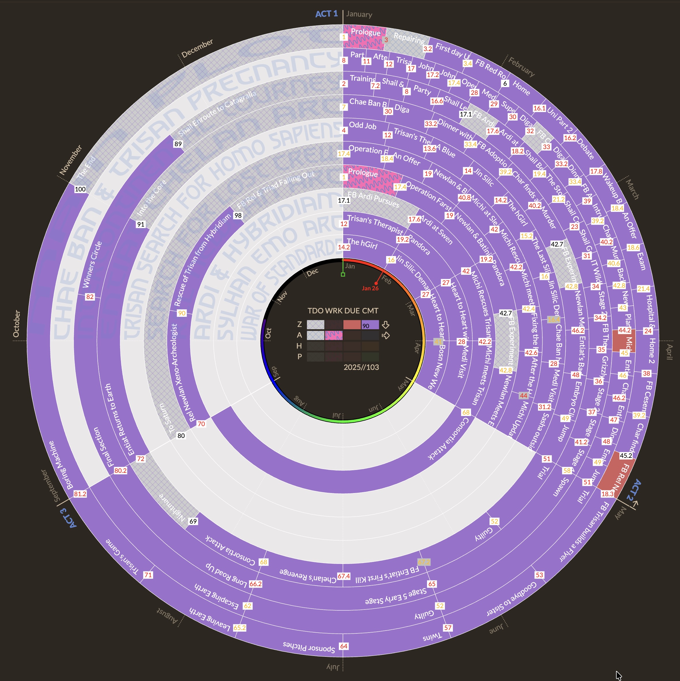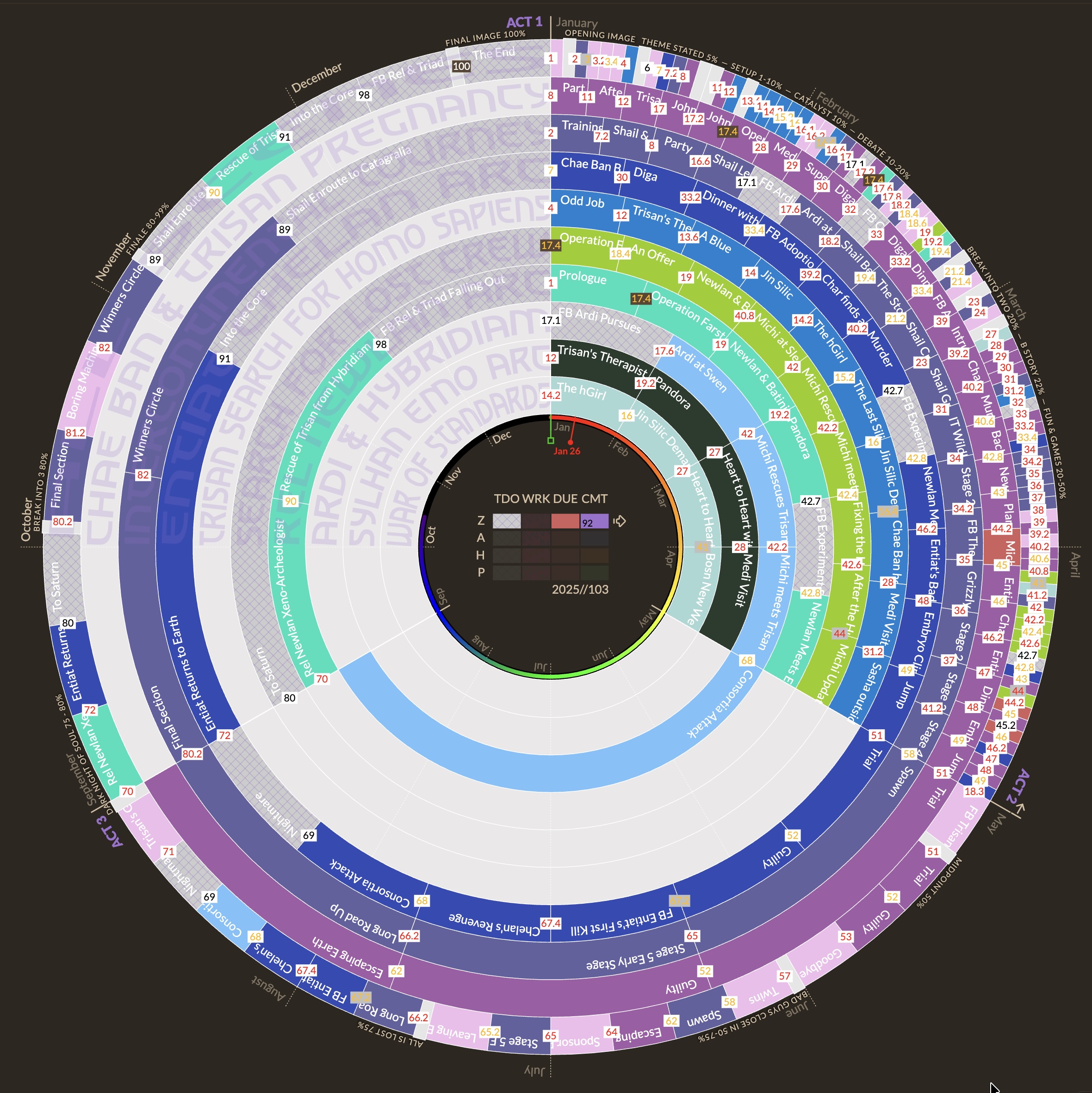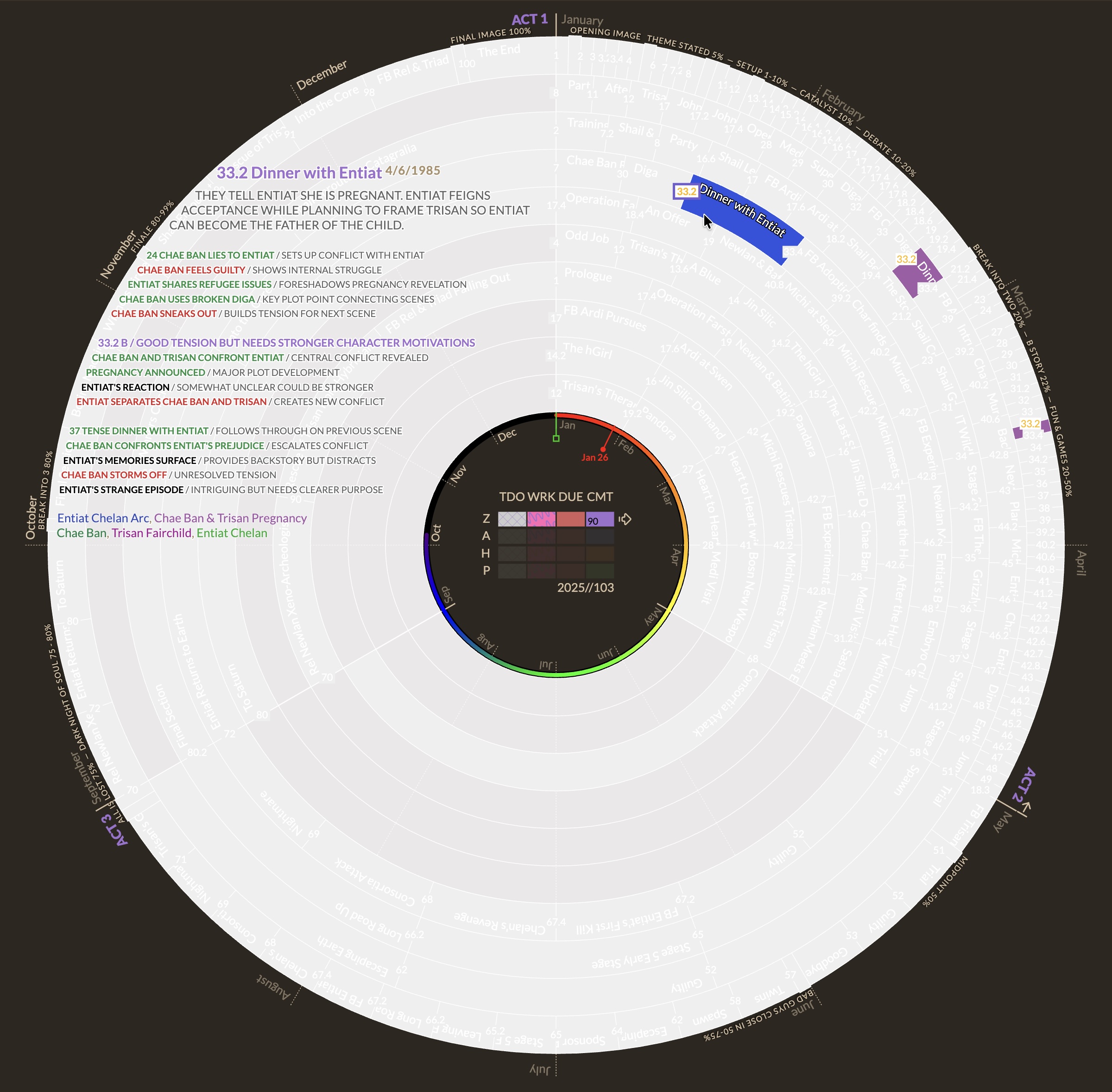 A comprehensive radial timeline for long-form writing that displays scenes organized by act, subplot, and numeric order in a radial format for a comprehensive view of the project.